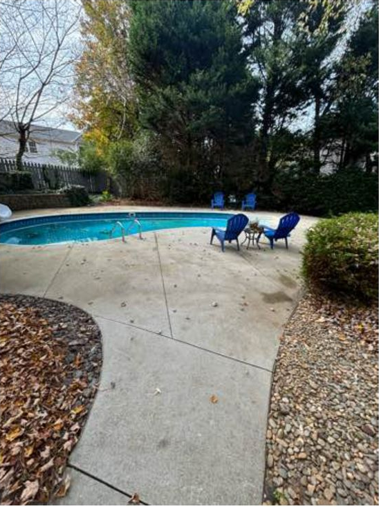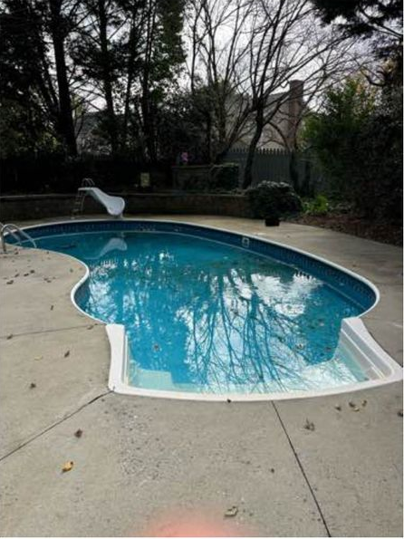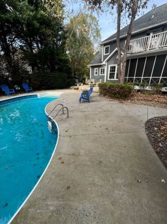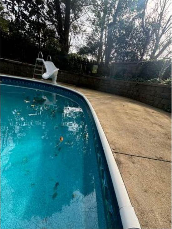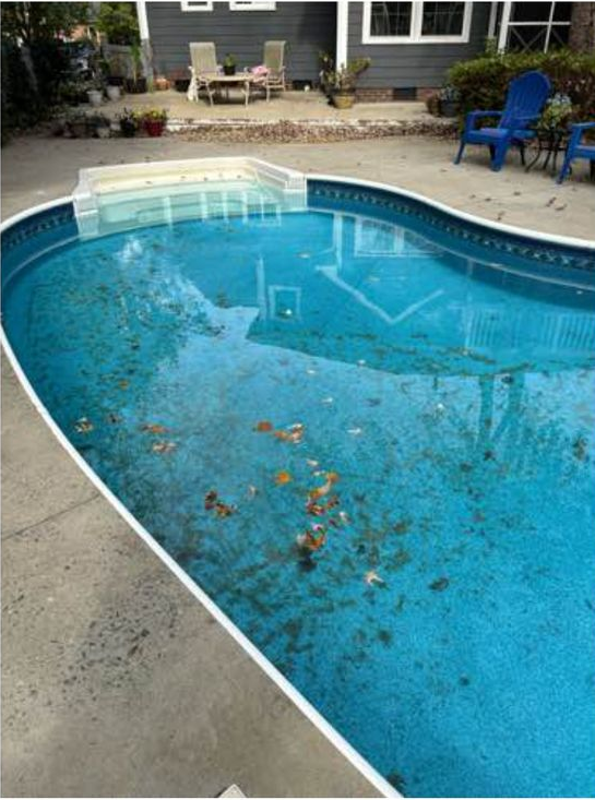 Pool has leaves and debris.
